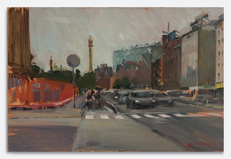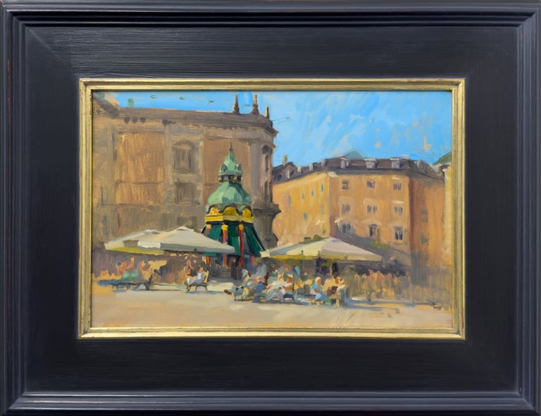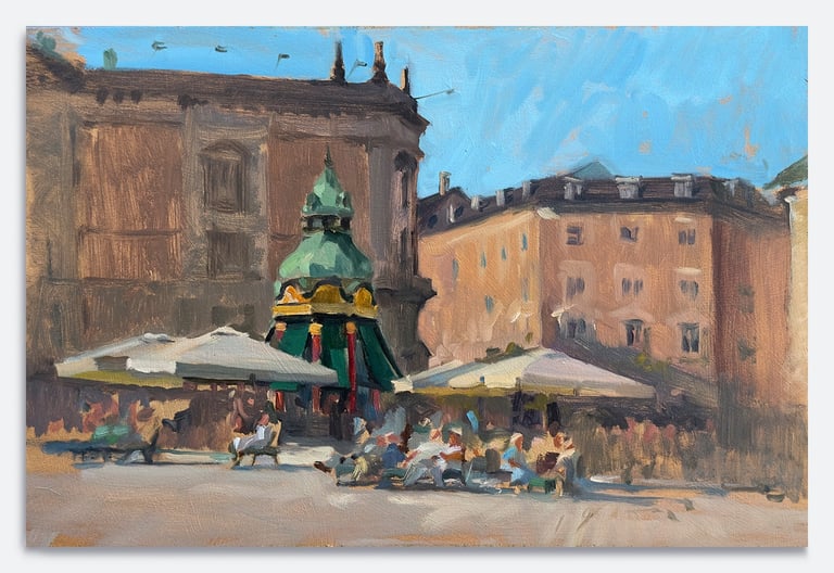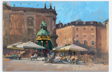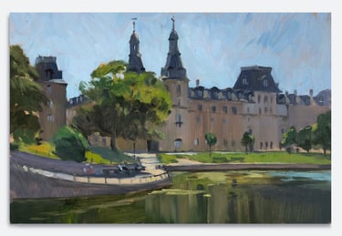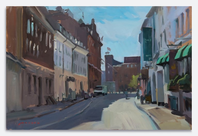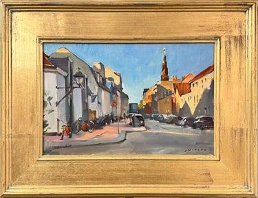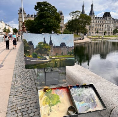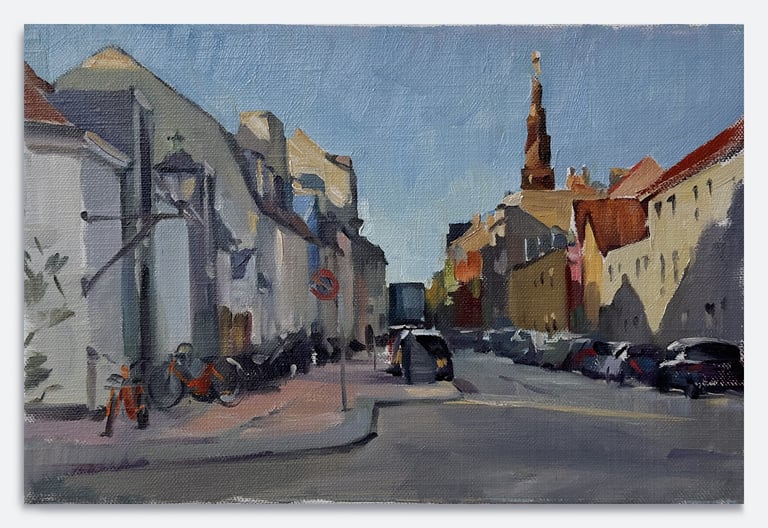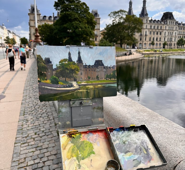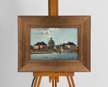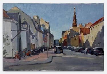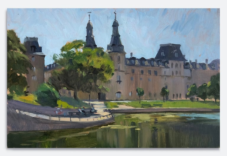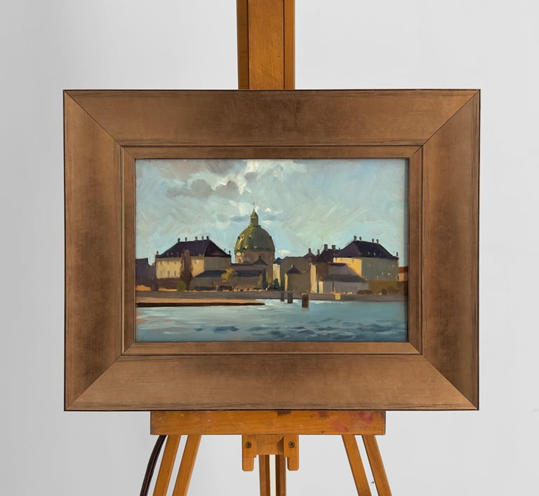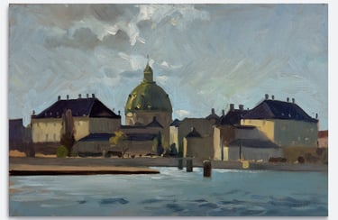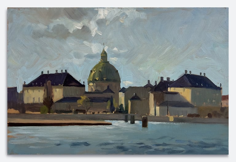 This painting was done on spot from life, some time in March 2025 What is so special about Amalienborg seen from the other side of the canal along with the Marble church is differentiated roof cascade with various building blocks creating a complex and playful architectural rhythm making that distant middle ground composition interesting enough to explore.