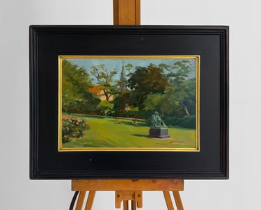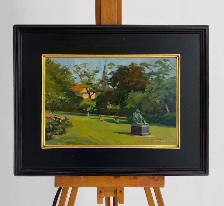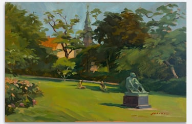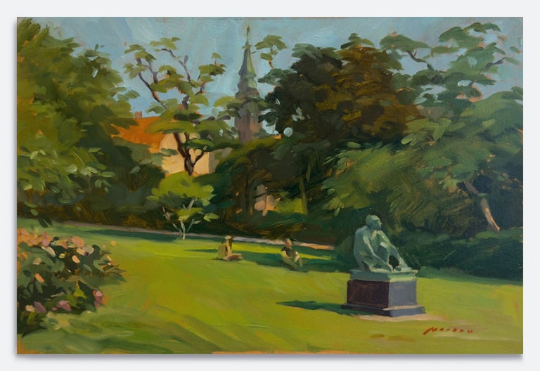 Sculpture of Grinder by an unknown artist in Ørstedsparken, Copenhagen. In this piece a wide area is given to the middle-ground trees that obscure the silhouettes of background buildings, conveying the feel of a city park. The sculpture is positioned in the foreground but off to the side, allowing more space for the open grassy area where park visitors sit still long enough to be painted.