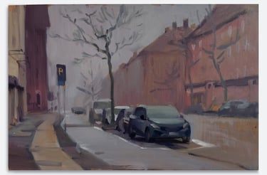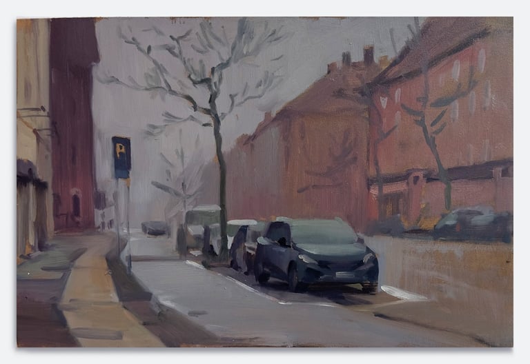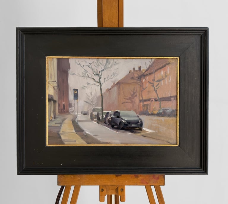 The first outdoor painting session of the season, February 2025. Misty weather always helps with subject selection—simplifying details and excluding unnecessary count of elements. The scene feels well layered and precomposed, distances compress and become short. Presented in a classic black frame with a gilded inner edge, the piece balances contemporary subject matter with traditional presentation.